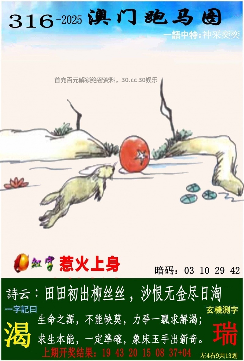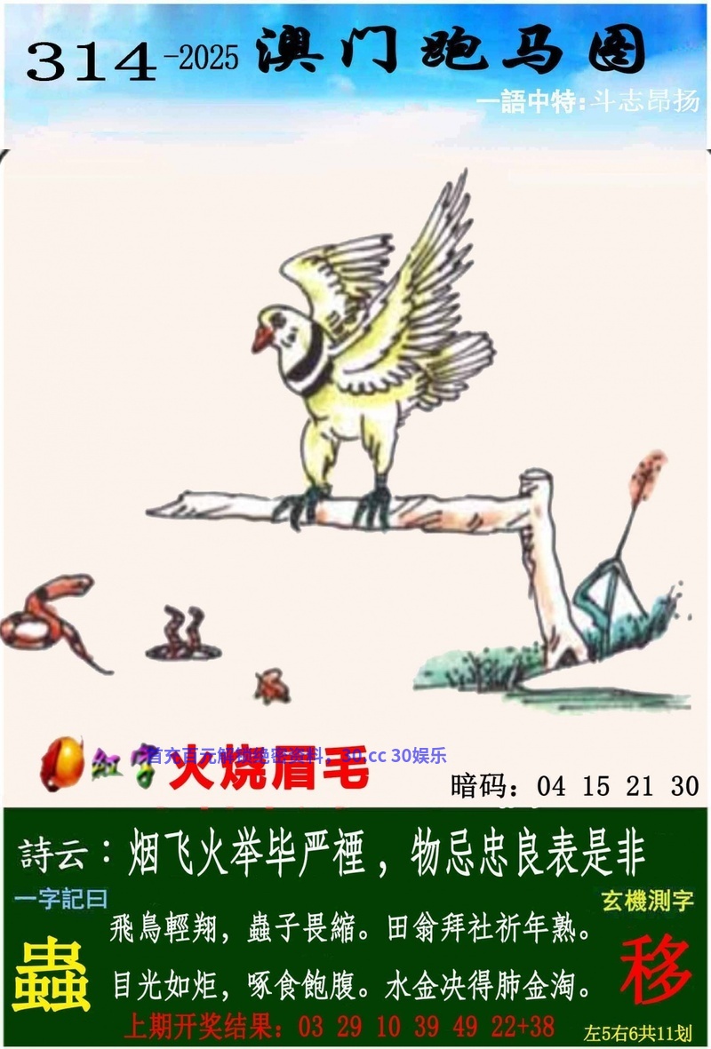 | 314期:西出阳关见瘦马 解释:西出阳关见瘦马,阳关,解阳肖牛虎兔羊猴鸡 藏宝九肖:牛虎兔羊猴鸡马蛇狗 藏宝⑩码:05.17.28.03.23.22.21.12.01.44 |
