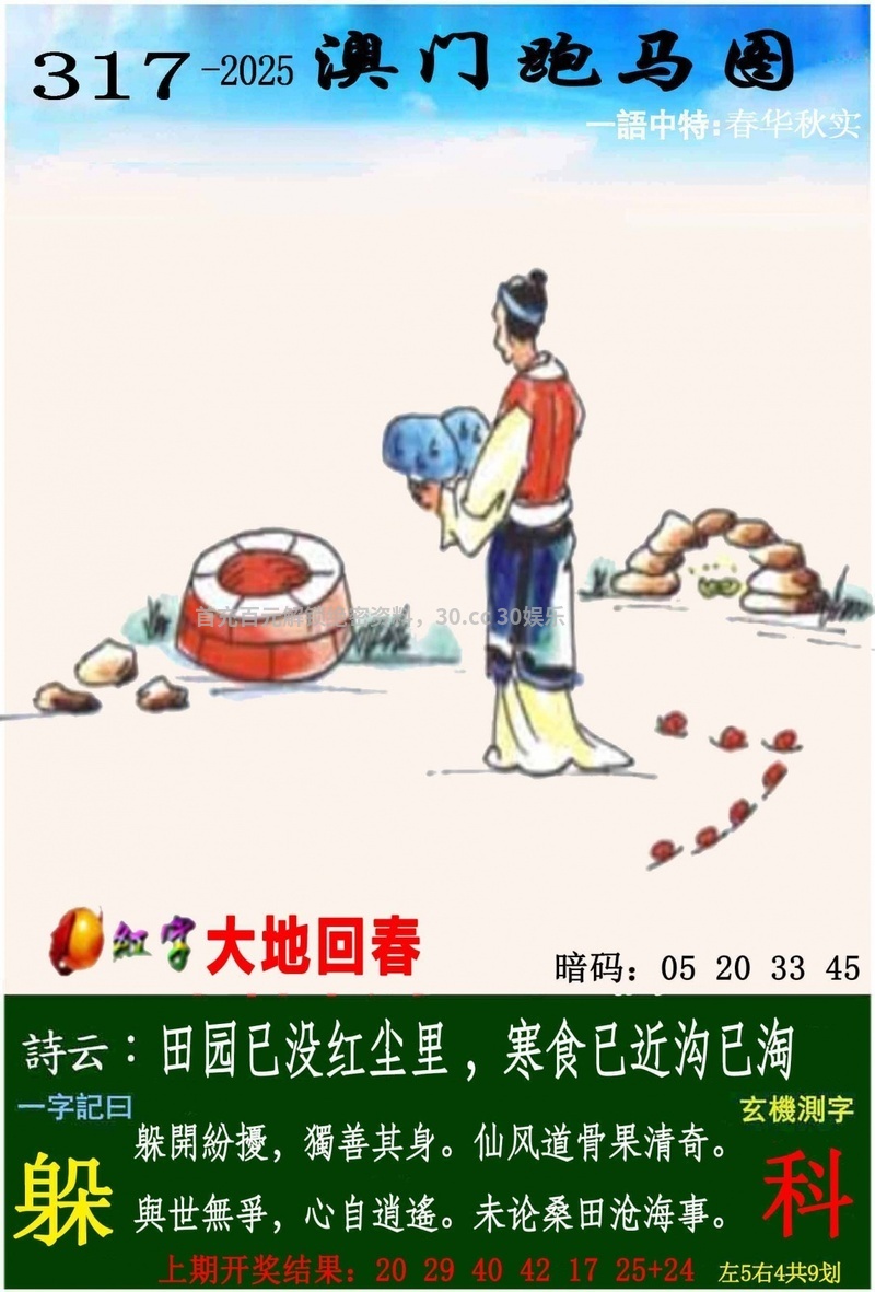 | 317期:风调雨顺报喜事 解释:风调雨顺报喜事,解吉肖蛇鸡龙马羊兔 藏宝九肖:蛇鸡龙马羊兔牛猪鼠 |