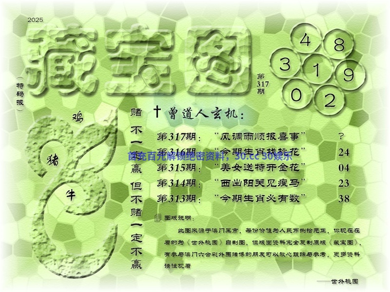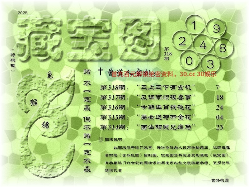 | 319期:三三灵码出物址 解释:三三灵码出物址,三三灵码解单肖猪羊兔蛇牛鸡 藏宝九肖:猪羊兔蛇牛鸡虎鼠狗 藏宝⑩码:31.43.11.03.25.05.21.28.30.32 |
